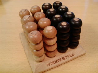 相手と順番に木の玉を棒に刺して、先に4個並んだ方の勝ち。